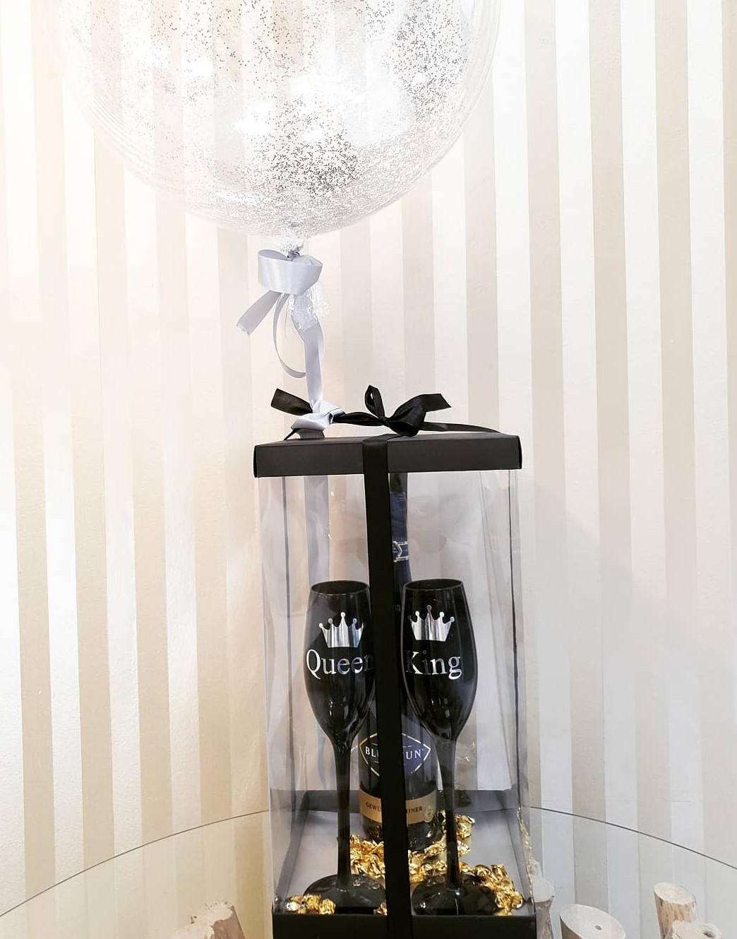 מארז יין הכולל בקבוק בלונאן וזוג כוסות עם כיתוב אישי פרחי סבון ריחניים ושוקולדים ובלון הליום נצנצים