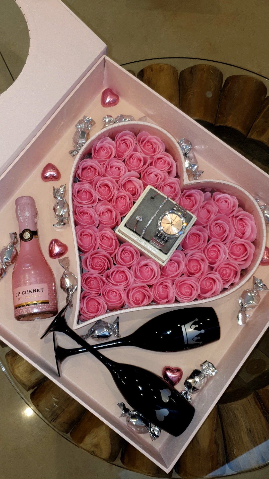 מארז לב ספר נפתח כולל פרחי סבון ריחניים, זוג כוסות עם כיתוב אישי ומיני בלונאן/ שמפניה