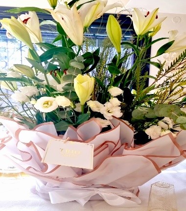 / סידור לשולחן – חגיגה בלבן ענק זר כולל ליליות וליזיאנטוסים
