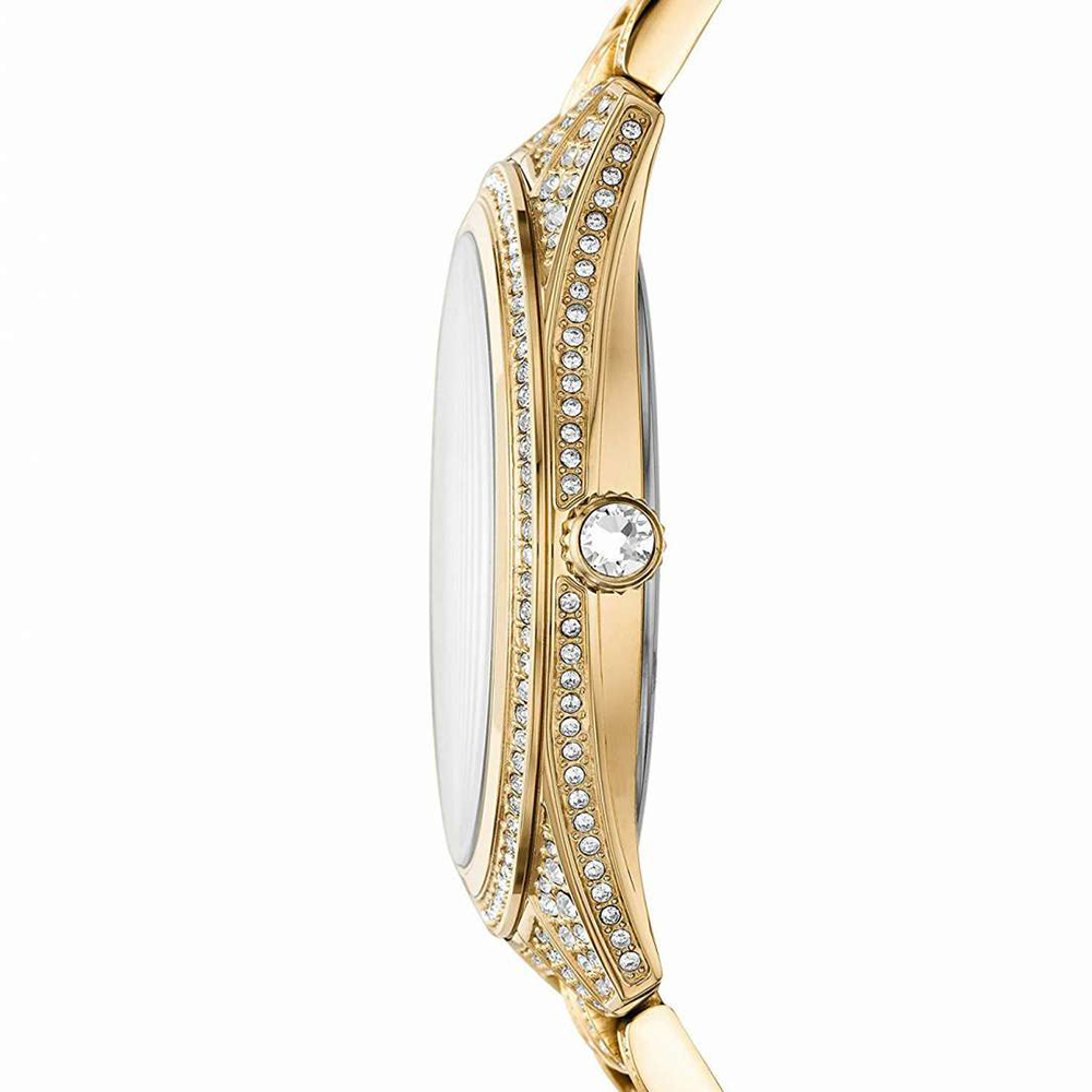 • גוף השעון: STAINLESS STEEL – פלדת אל חלד בציפוי זהב ושיבוץ אבני זירקון.